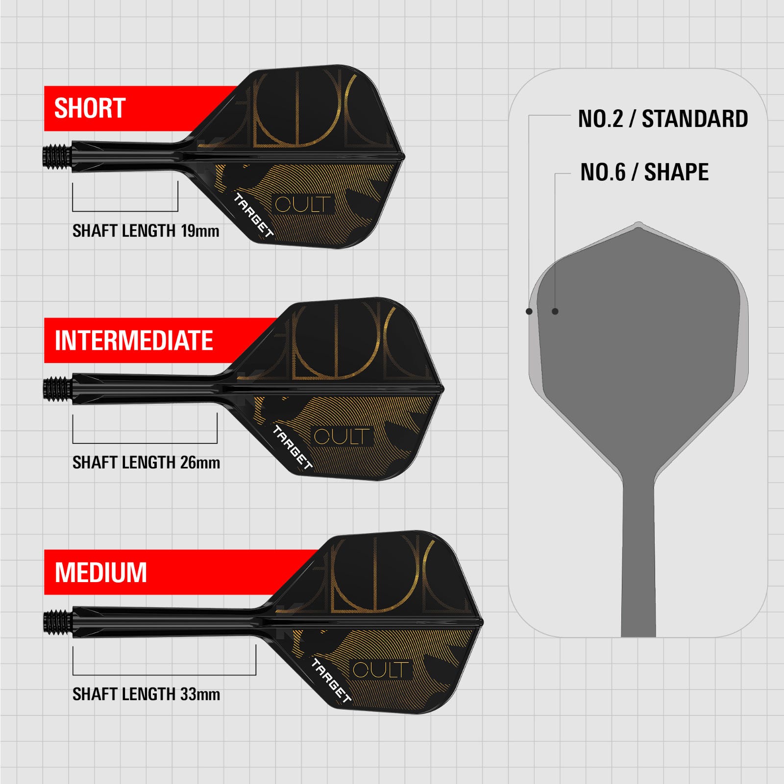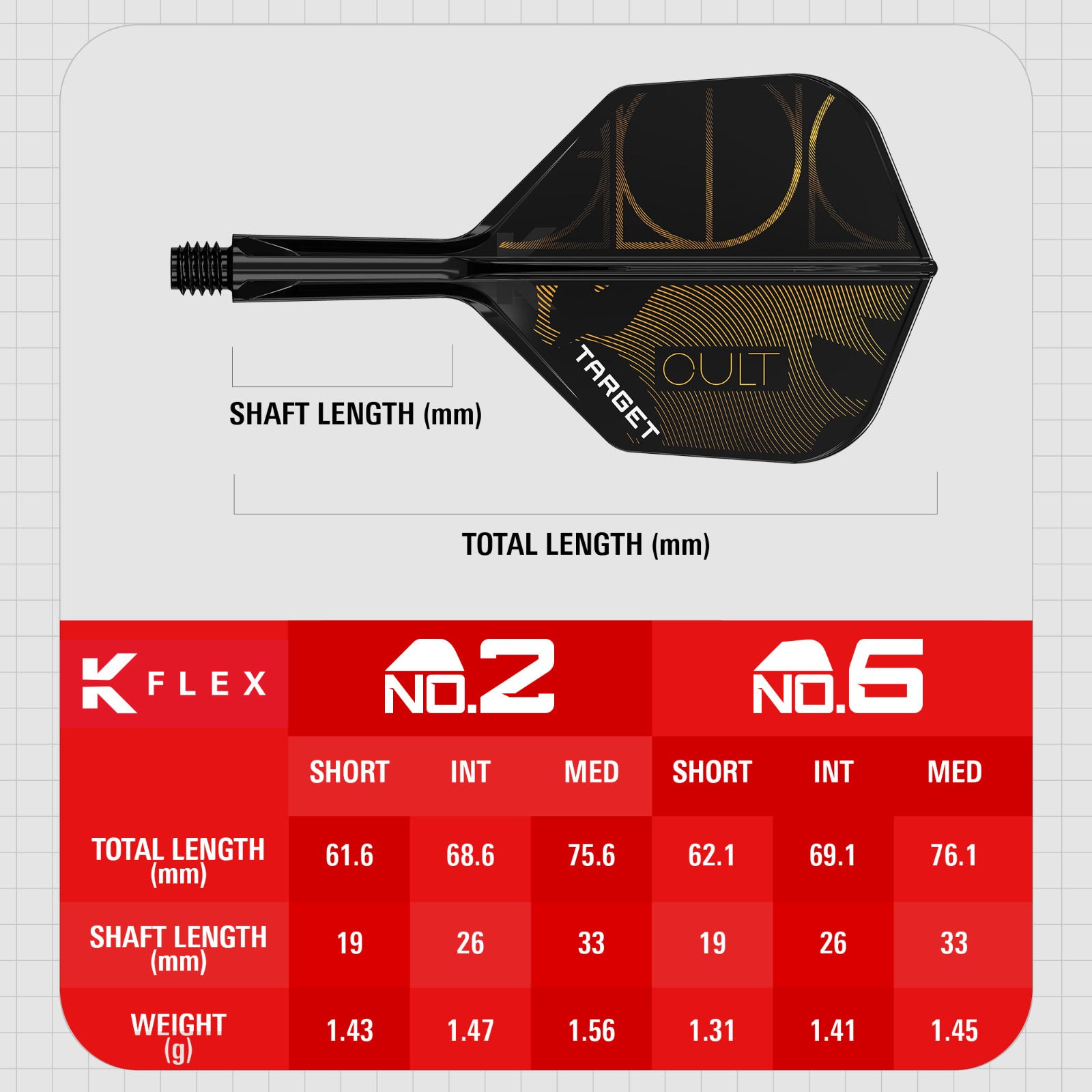 The Cult edition K-Flex integrated dart flights & shafts are crafted as the perfect complement to the Cult dart series. Finished in sleek black with gold detailing, the design features the bold, elegant Cult logo & abstract linework inspired by the signature barrel styling.