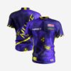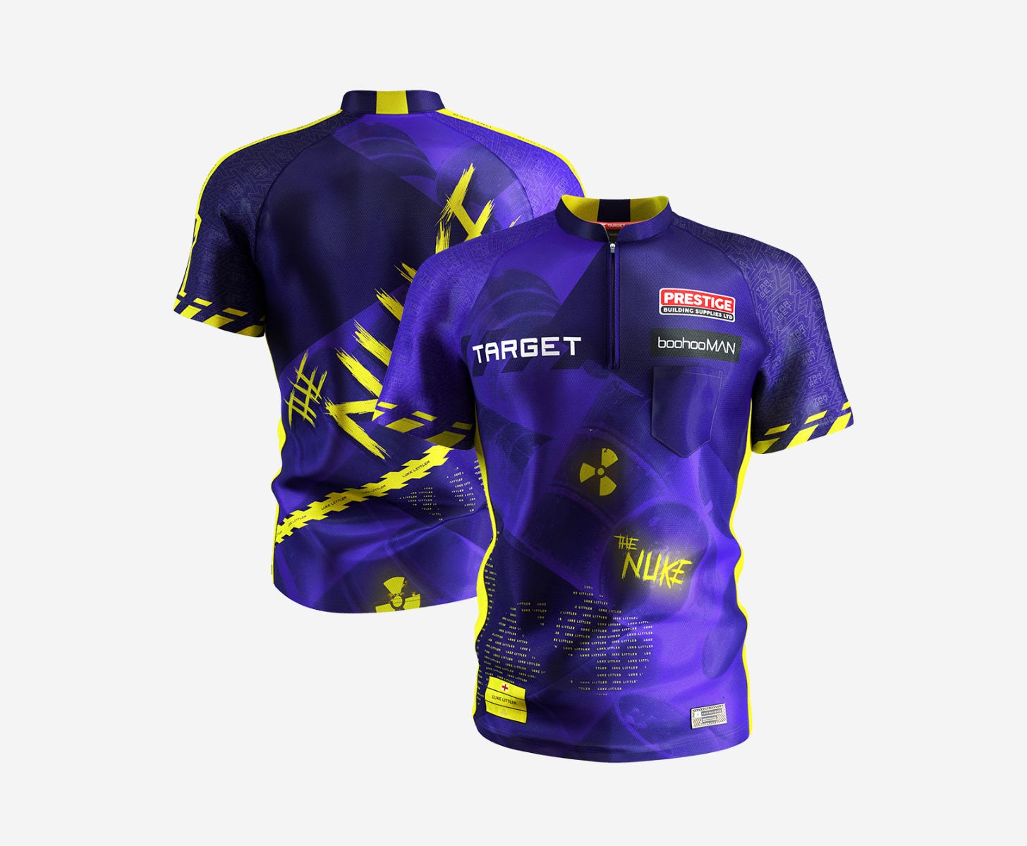 The shirt displays bold nuclear-themed graphics, including radioactive symbols and nuclear barrels. Neon yellow highlights adorn the sleeves and sides, while “The Nuke” is prominently displayed across the shirt’s signature purple design, making it as explosive as Luke’s talent on the oche.