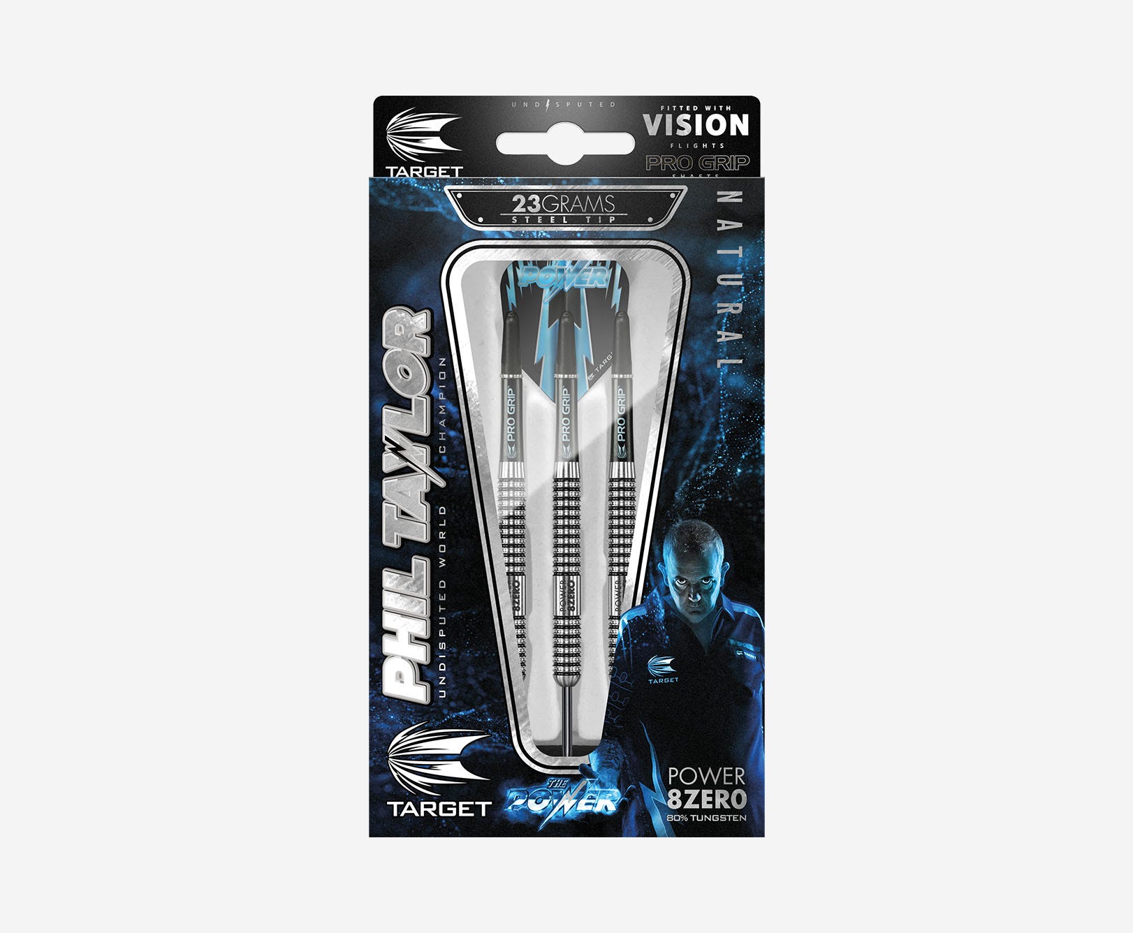 Phil ‘The Power’ Taylor with 16 World Championship titles and 76 other major titles worldwide, Phil is known as the greatest darts player of all time. Phil in conjunction with Target’s team of designers collaborated to produce the finest range of darts ever seen. The Power 8Zero is machined from an ultra-dense 80% Tungsten billet, the dart is then hand loaded into a Japanese CNC lathe for its machining process. The dart is then Intricately enameled by hand before being completely re-machined to give the unique and intricate grip. The addition of the laser etched Power 8Zero logo, steel points, the Target Pro Grip shaft, and Vision Flights complete a truly stunning dart.