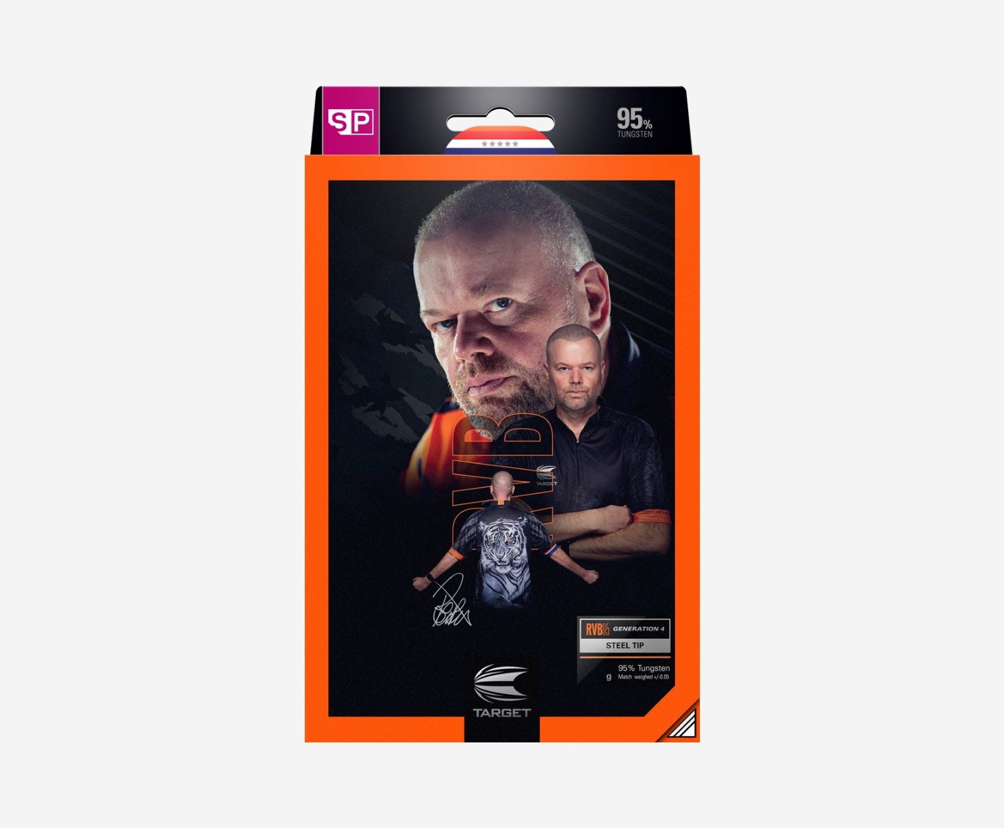 The Raymond Van Barneveld 95 Gen 4 SP steel tip dart has been designed alongside RVB and his exact requirements. The result is a highly complex and beautifully designed 95% tungsten dart which offers a multitude of different grips and feel suiting all techniques. The gently front loaded barrel encompasses three grips (knurled, milling and radial) which is overlaid with both black & gold PVD performance coatings providing a grip & feel which is unrivalled. Completing the gen 4 dart is the Heli shaft adding increased grip at the rear, signature No.6 RVB Flights & black Swiss Firepoints.