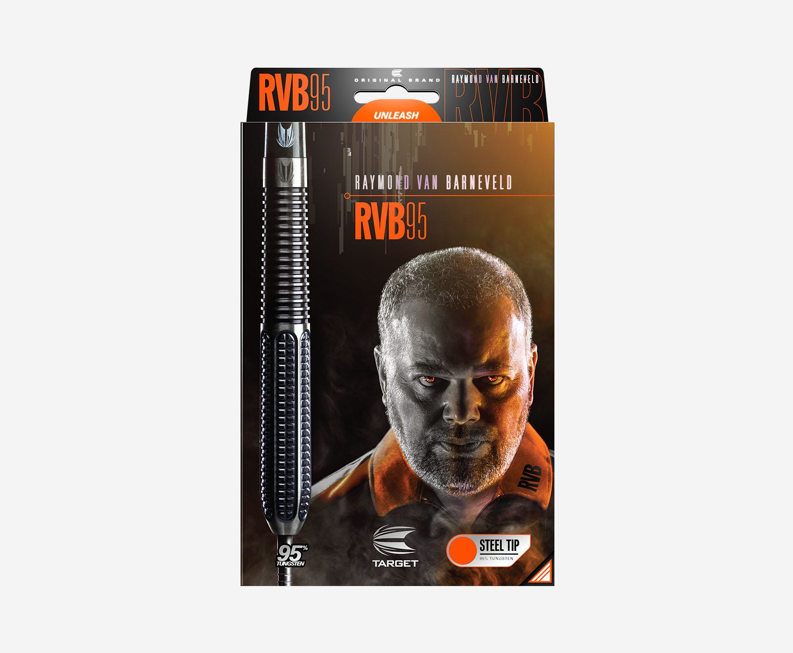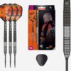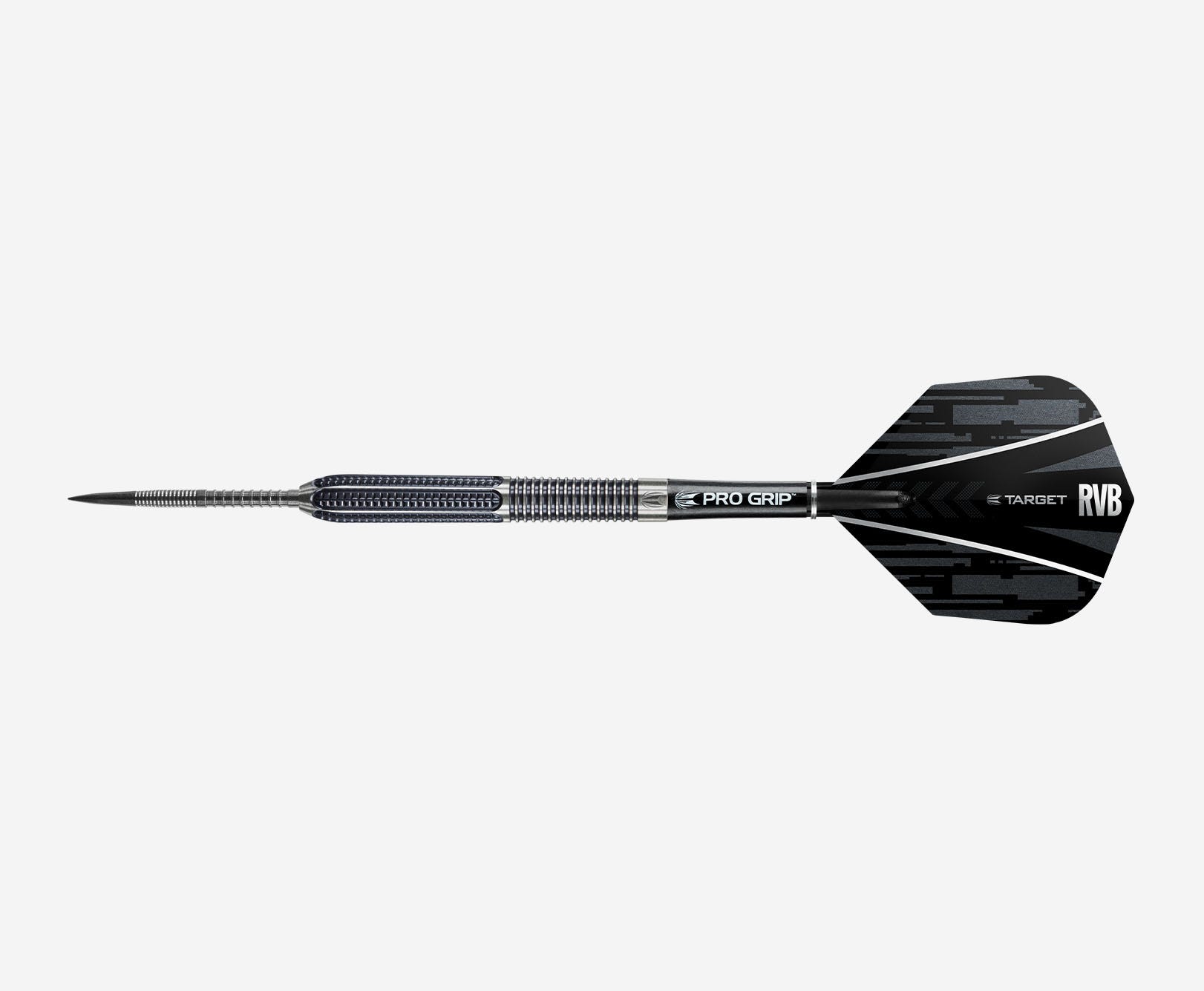 The RVB 9Five Generation 1 from Target Darts. The RVB 95 G1 dart has been developed with Target’s team of designers to produce excellent results for the 5 x World Champion’s unique throw. Cut with a combination of trapezoidal milling at the front end and contrasting radial grooves at the back. Black titanium coated, and fitted with Target Firepoints.