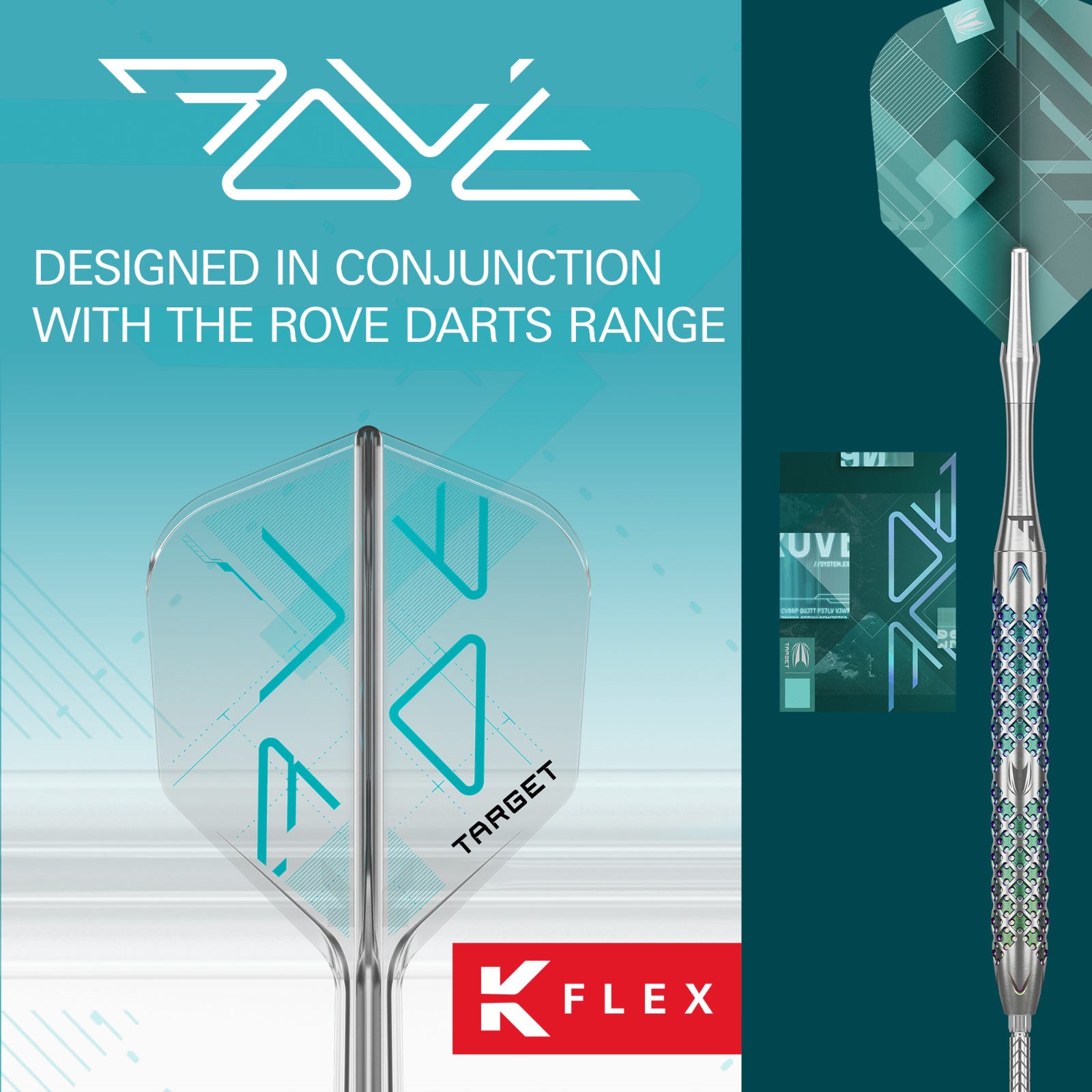 The Rove edition K-Flex integrated dart flights & shafts are crafted to echo the premium aesthetics of the Rove dart range. Manufactured in crystal-clear material, the flight showcases a sharp, minimalistic design accented by the bold, angular Rove logo in vibrant teal.
