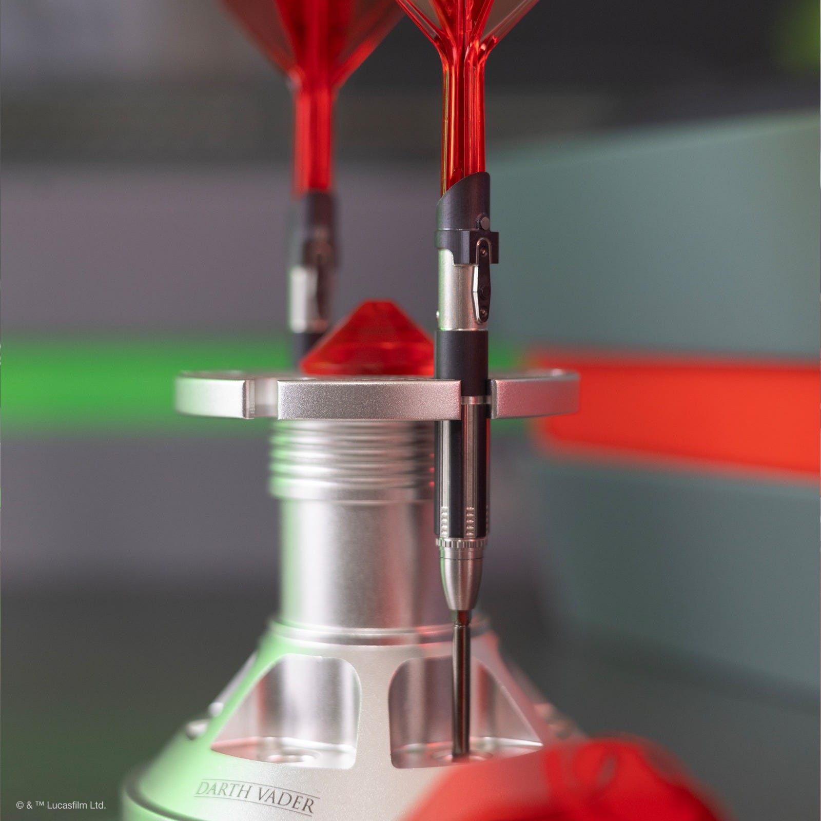 The red K-Flex integrated flights and shafts illuminate the dart with the vivid glow of Vader’s blade. Moulded as a single piece for stability, their translucent design captures the sword’s energy.