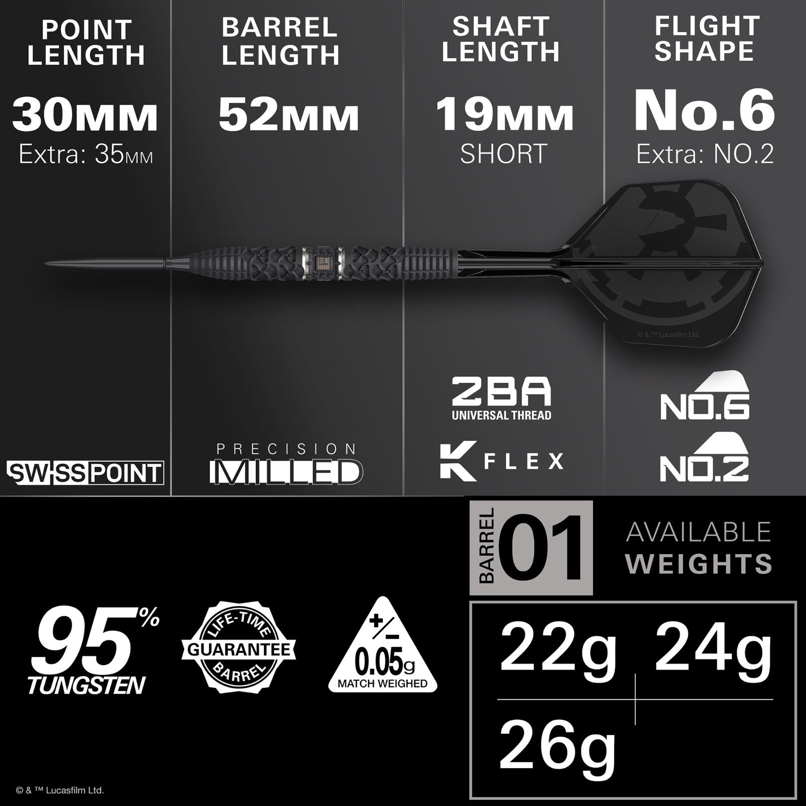 The 95% tungsten barrels are precision-milled and laser-engraved with Darth Vader detailing, combining intricate machining with a sleek black PVD performance coating. The result is an exceptional grip and flawless balance that echoes the strength and authority of the Sith, ensuring every throw delivers accuracy and command.