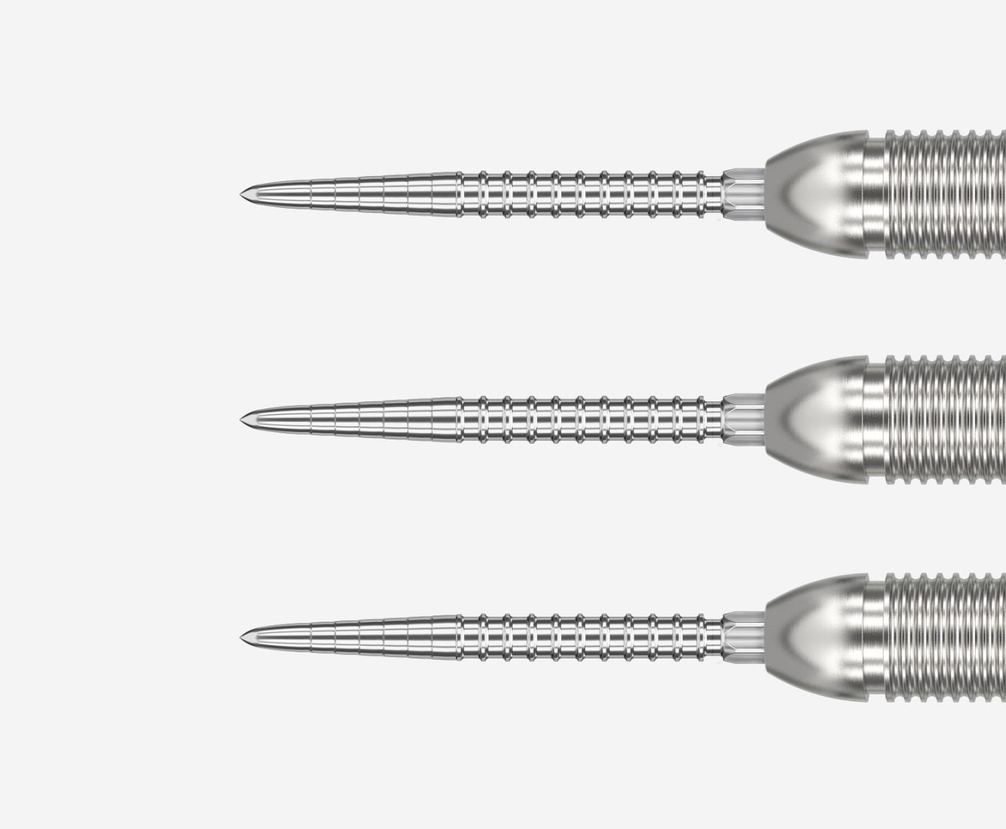 Target’s Swiss Chrono Points are engineered in collaboration with the Chrono darts, featuring precision ridges at the tip for secure dartboard entry and CNC-machined grooves for enhanced finger grip. The design delivers complete control and a smooth, confident release for consistent performance.