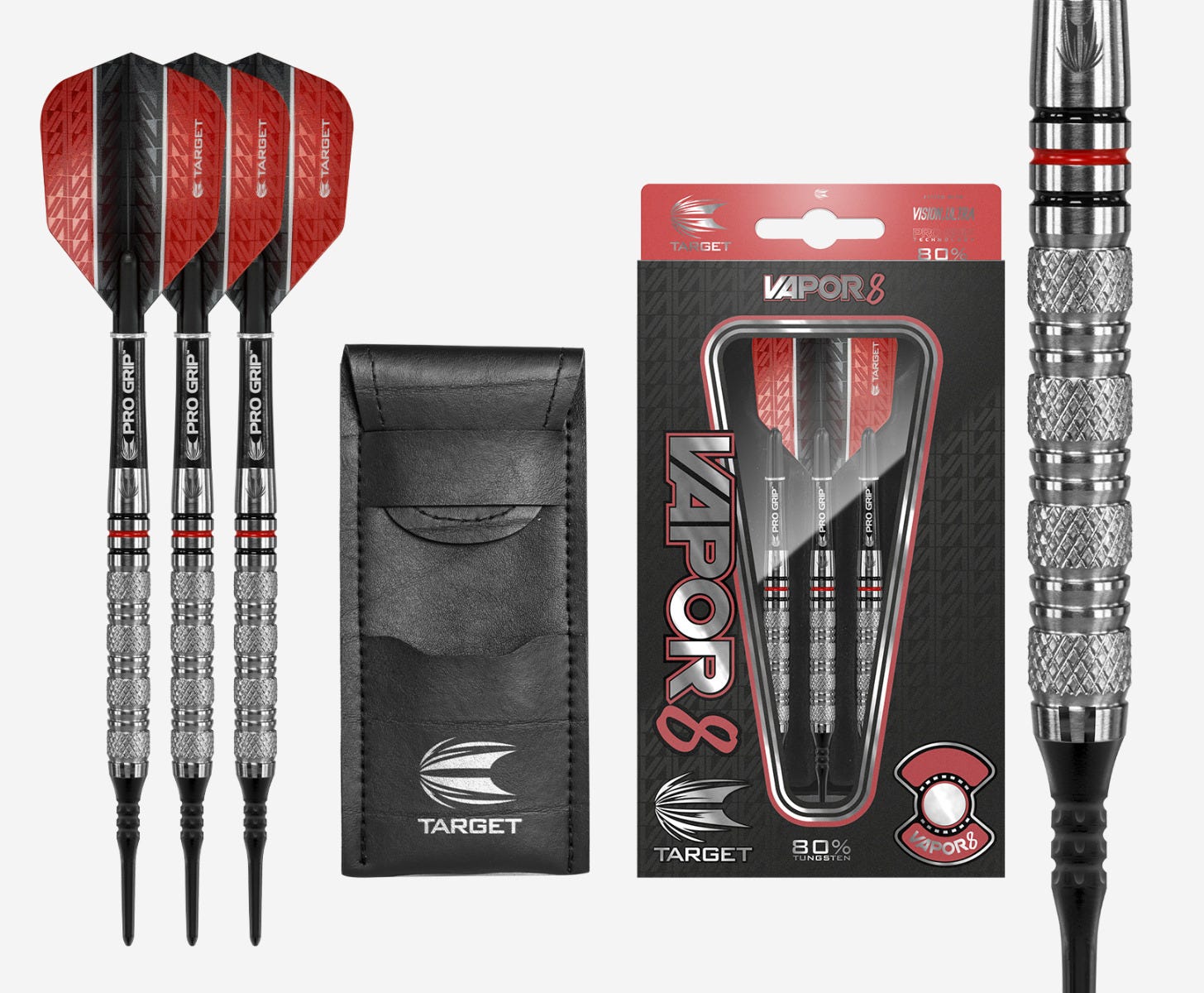 Created to provide a professional level dart in varied shapes, weights and designs to suit any playing style. Vapor8 brings a modern, high-end feel to the entry level target range. The Vapor8 range features a wide variety of barrel shapes, weights and designs, with distinctive black and red radial grooves. All of the Vapor8 barrels come fitted with Target Pro Grip shafts, Vision Ultra flights and dart wallet.